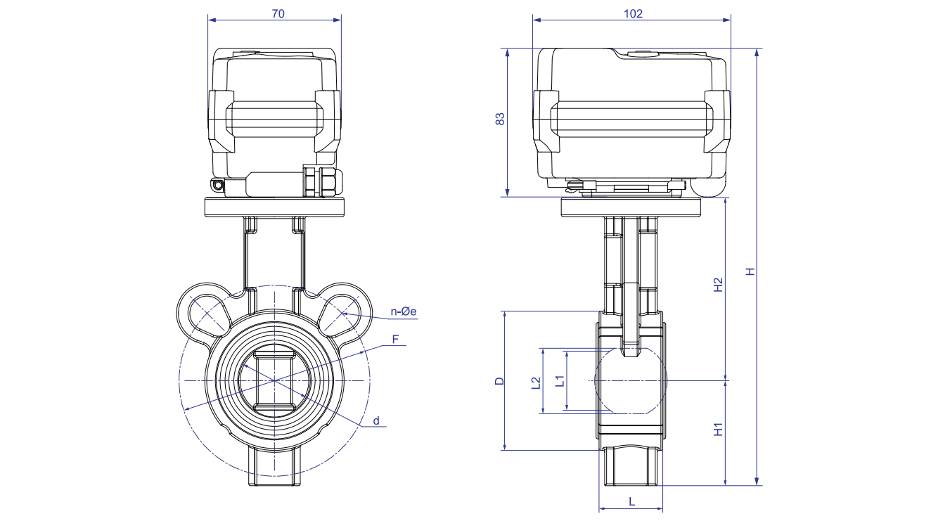 | 口径 | d | D | F | L | L1 | L2 | H1 | H2 | H | n-Фe | W (kg) |